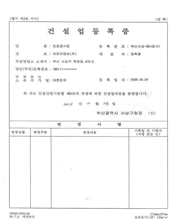 아트피엔씨㈜는 건축 도장및 중방식 도장에 20년간 축적된 제품및 도장 기술의 노하우를 바탕으로 완벽한 시공과 A/S 및 B/S에 만전을 기하고 있습니다.