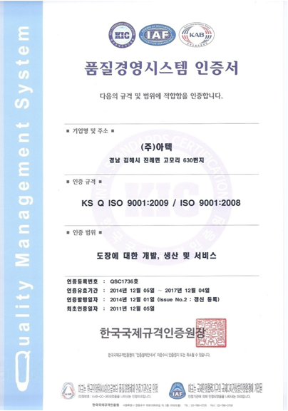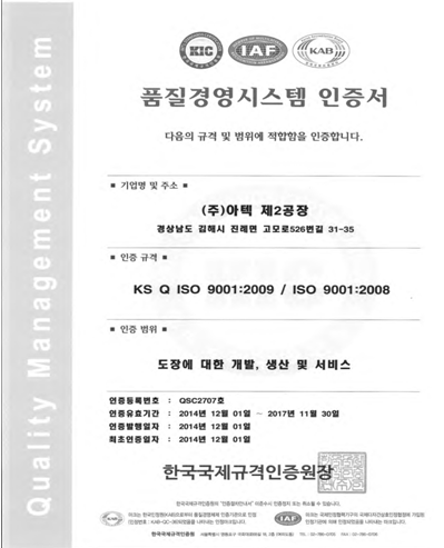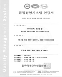 KS Q ISO 9001:2009/ISO 9001:2008품질경영시스템 인증서