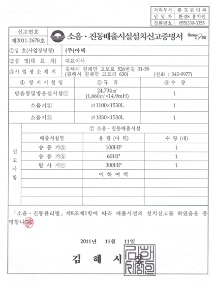 소음.진동 배출시설설치 신고 증명서