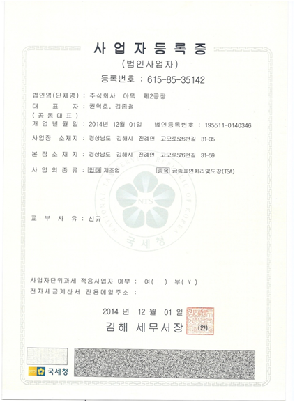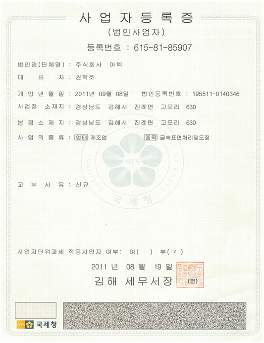 사업자등록증주식회사 아텍 제2공장